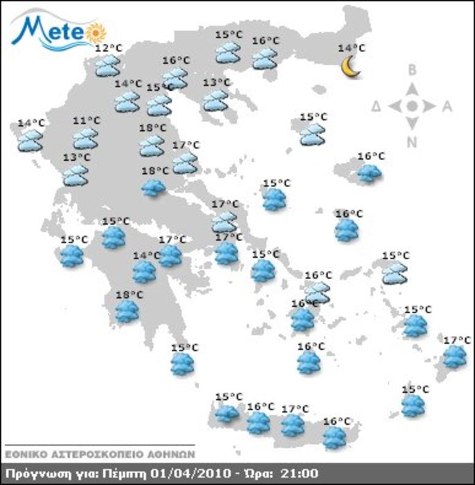 Αραιές νεφώσεις κατά περιόδους πιο πυκνές σε ολόκληρη τη χώρα περιμένουμε τη Μεγάλη Πέμπτη 1 Απριλίου 2010.